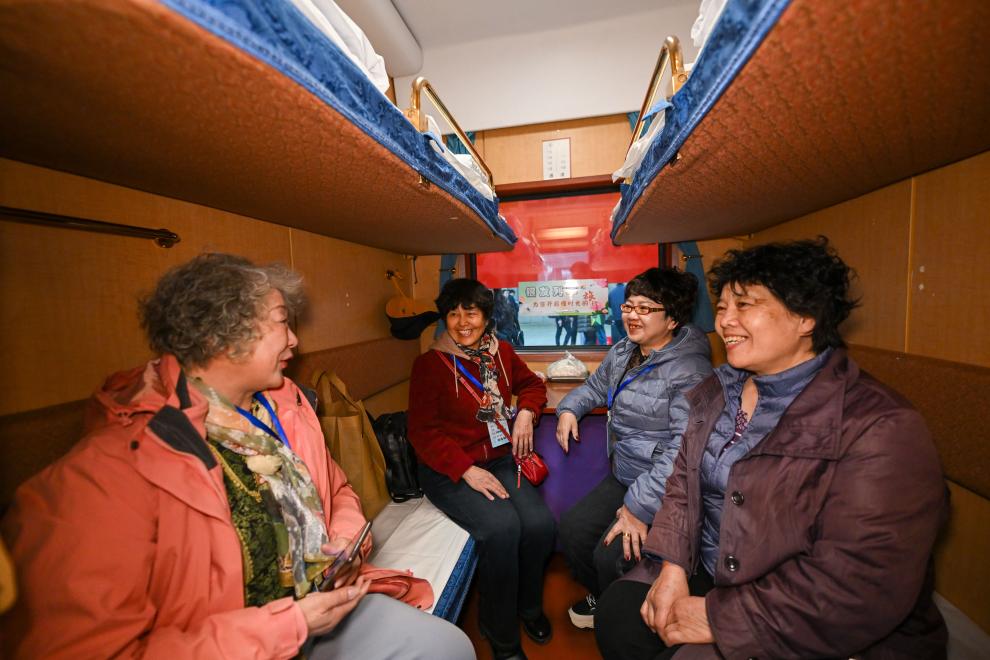 15日、シルバー観光列車「京鉄楽遊」号の車内でくつろぐ乗客たち。(天津=新華社記者/孫凡越)