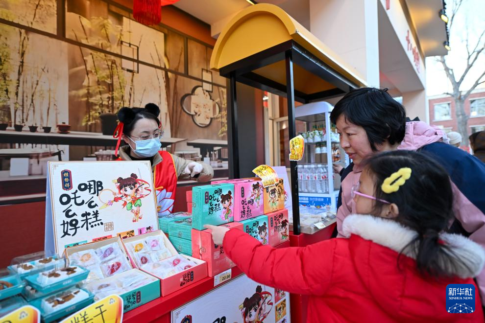 16日、天津市河西区にあるナタ小鎮で、ナタをテーマにした商品を購入する観光客。(天津=新華社記者/孫凡越)