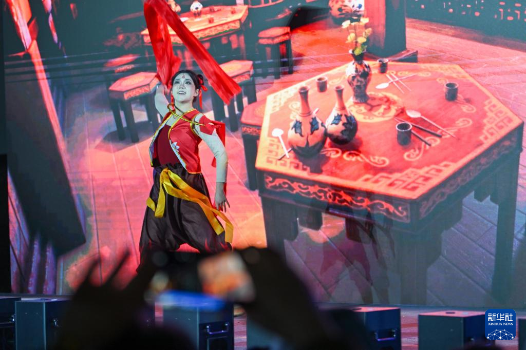 15日、天津市河西区にあるナタ小鎮で、ナタの衣装を身に着けパフォーマンスを披露する出演者。(天津=新華社記者/孫凡越)