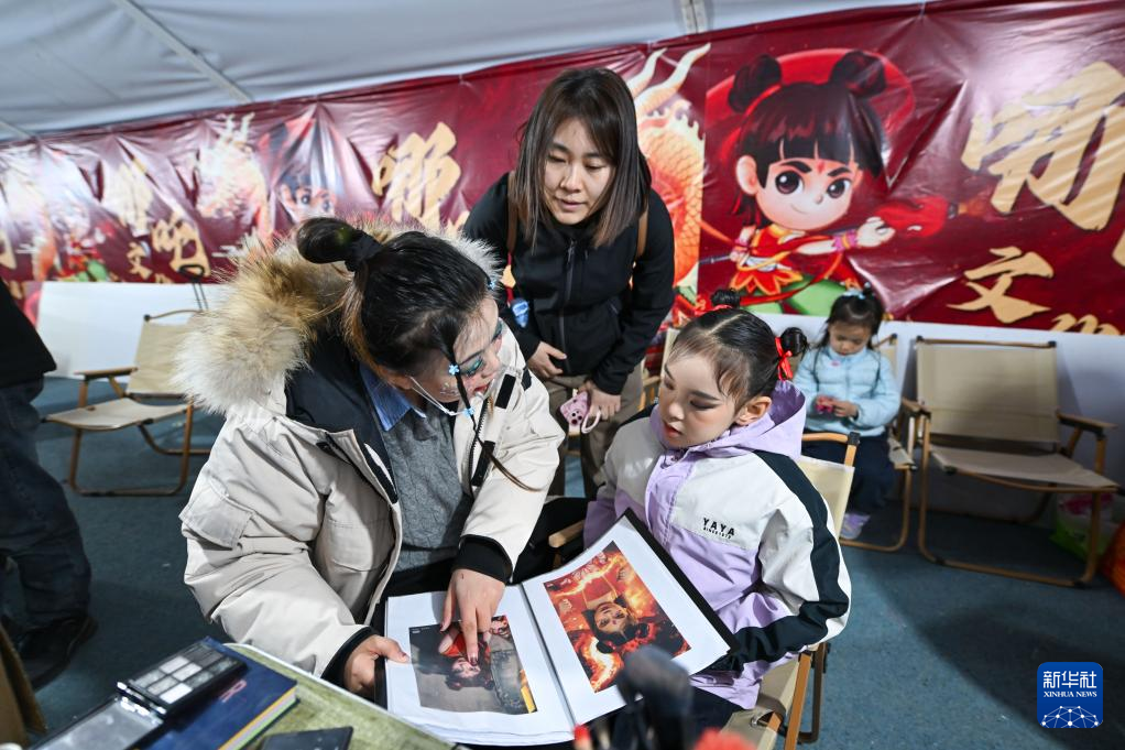 16日、天津市河西区にあるナタ小鎮で、髪飾りを選ぶ子ども。(天津=新華社記者/孫凡越)
