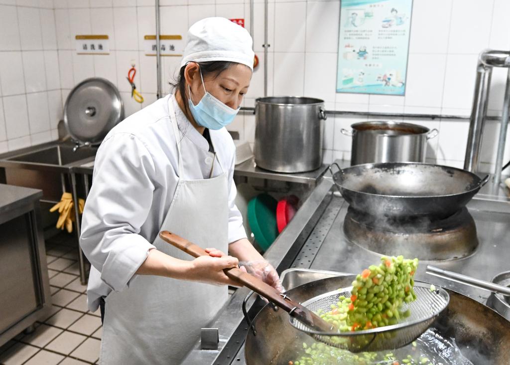 21日、中国農業大学東キャンパスの食堂で、低脂肪栄養食を調理するスタッフ。(北京=新華社記者/陳鍾昊)