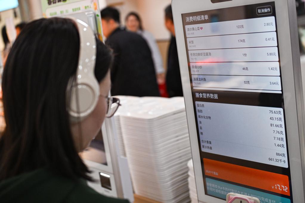 21日、中国農業大学東キャンパスの食堂に導入されたスマート設備で食事の栄養データを確認する学生。(北京=新華社記者/陳鍾昊)pagebreak