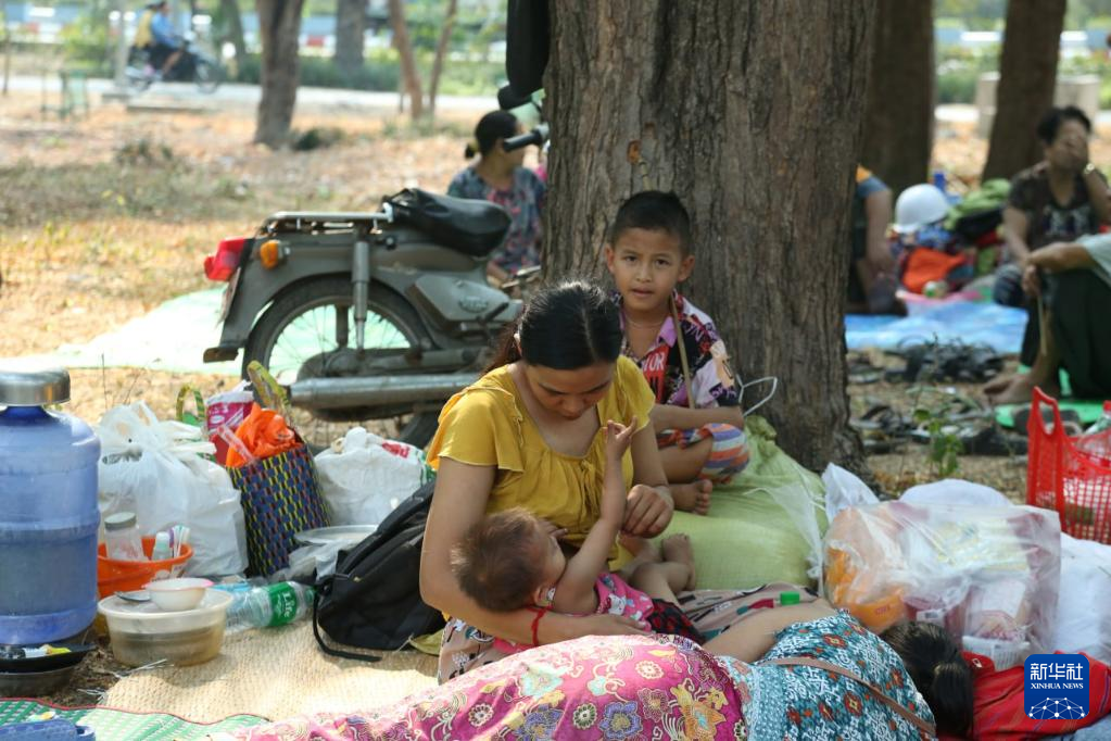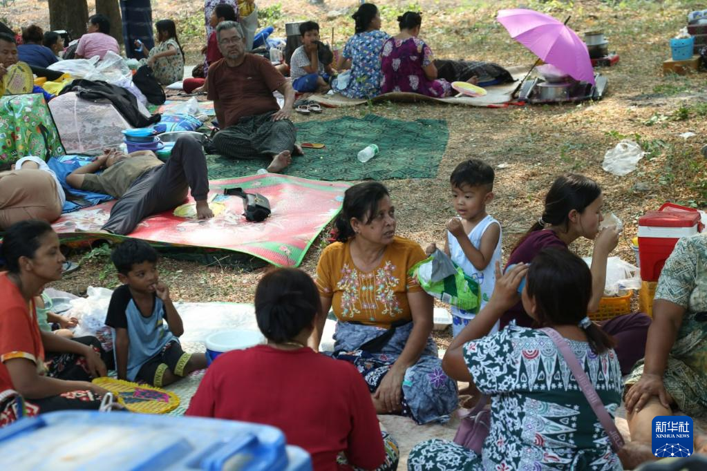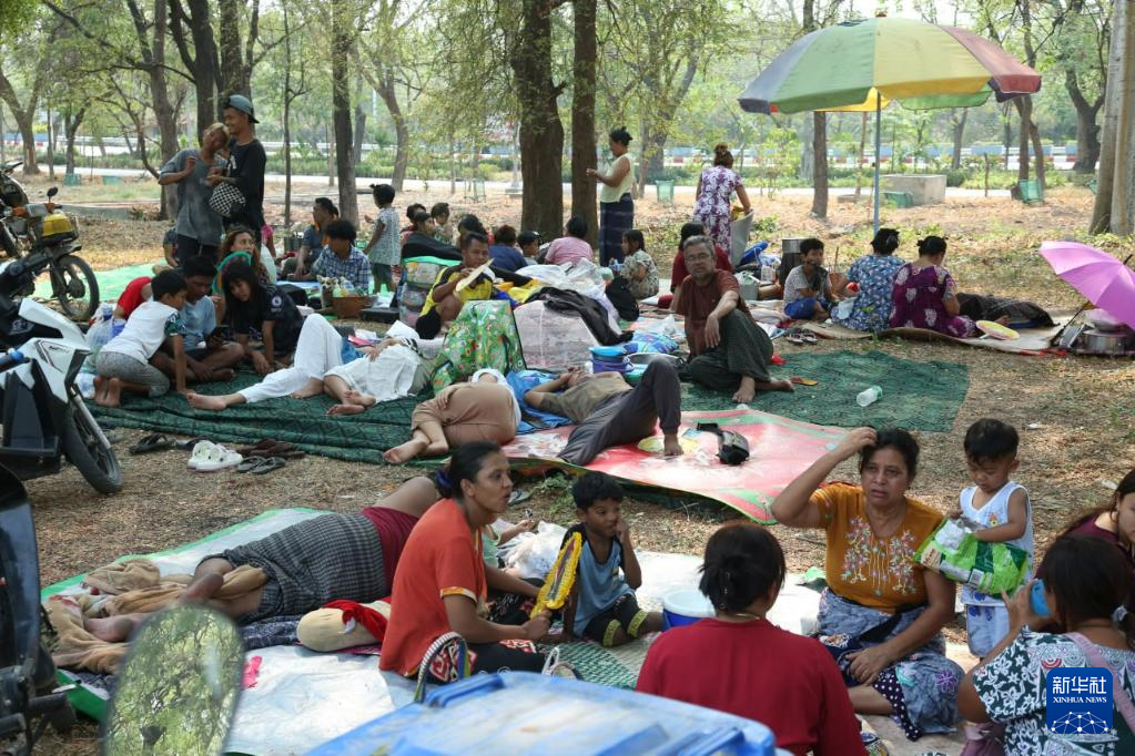 29日、ミャンマー・マンダレーで、屋外に避難した被災者。(マンダレー=新華社配信/苗覚梭)pagebreak