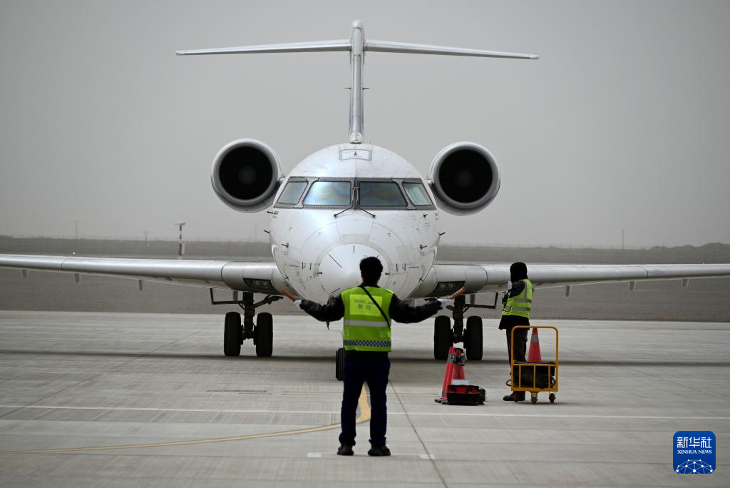 3月30日、甘粛省の敦煌莫高国際空港に到着した敦煌-ハミ-コルラ線の第1便。(敦煌=新華社配信/張暁亮)