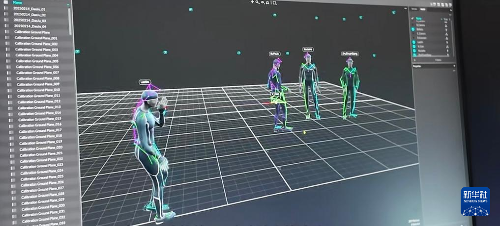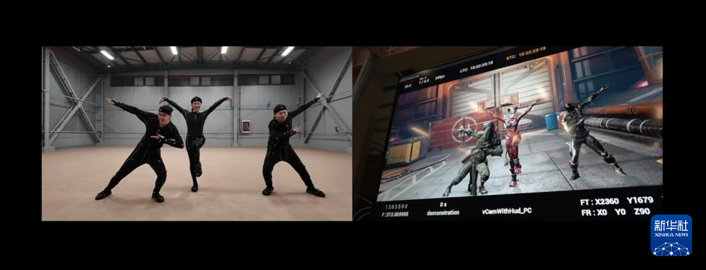 3月28日、蘇州高鉄新城デジタル撮影スタジオでのモーションキャプチャー撮影。左が実際の動作、右が生成されたアニメーション。(蘇州=新華社配信)