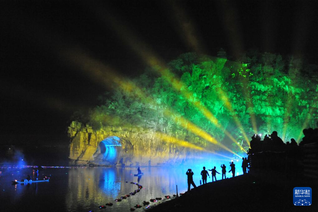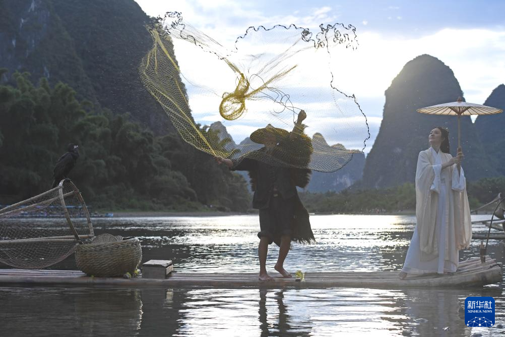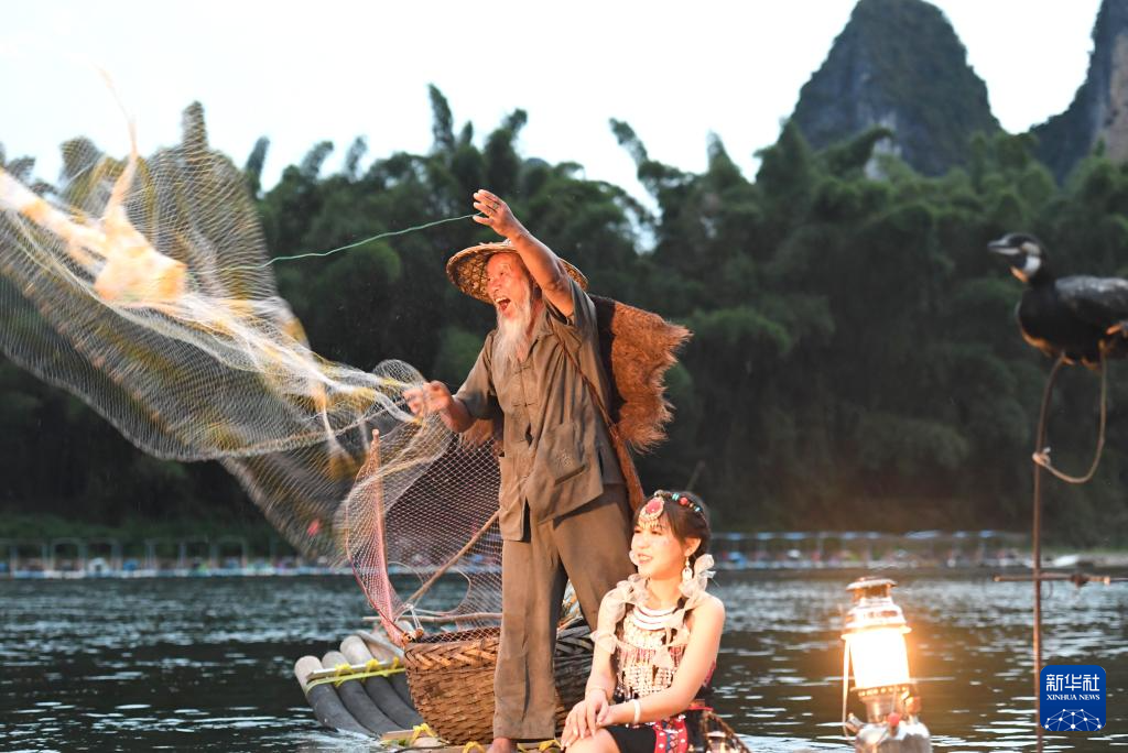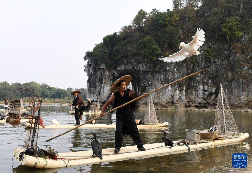 桂林の象山風景区で披露された鵜飼いの様子。(2017年10月24日撮影、桂林=新華社記者/陸波岸)