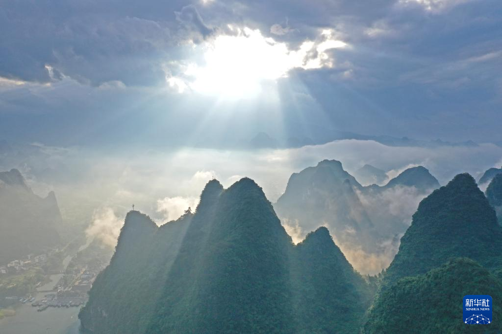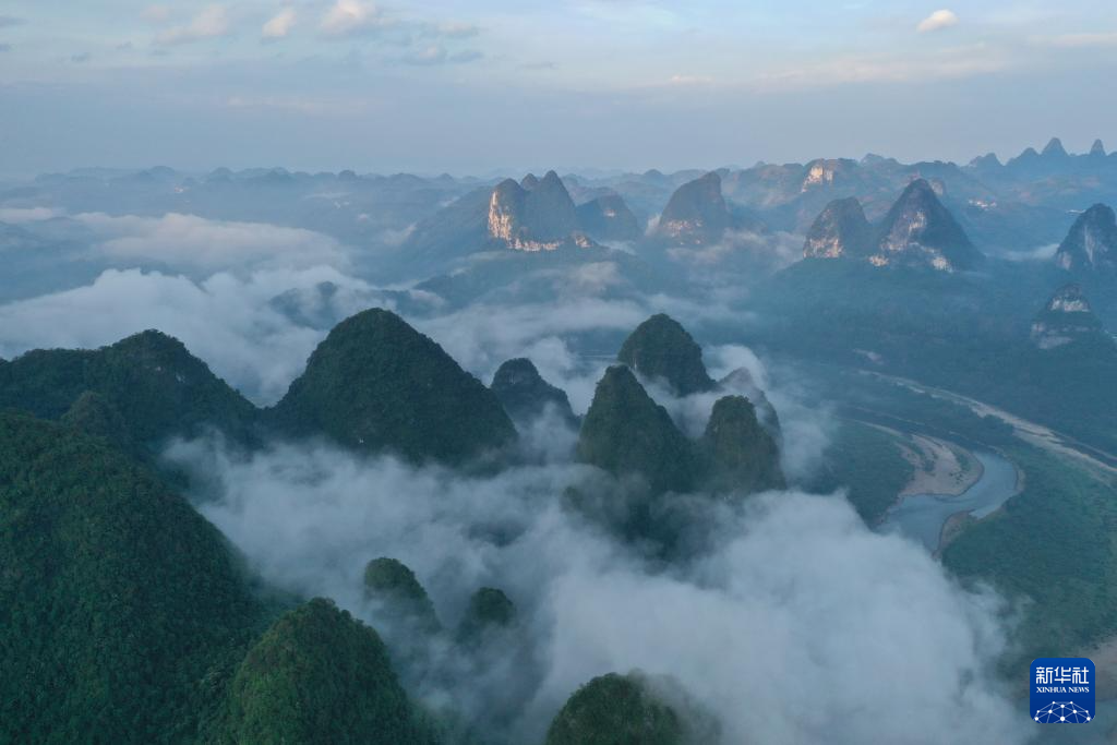 漓江沿岸に広がるカルスト地形。(2022年8月25日、ドローンから、桂林=新華社記者/周華)