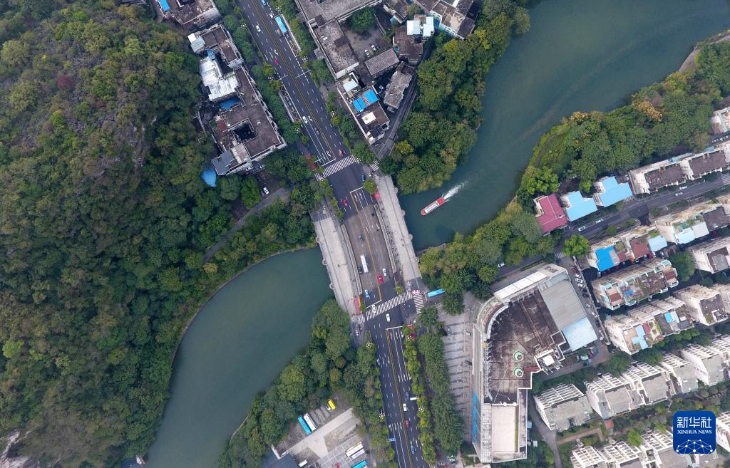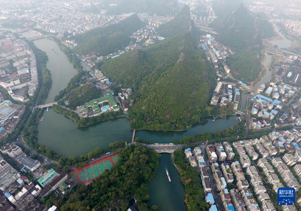 空から見た桂林市街。(2018年10月17日、ドローンから、桂林=新華社記者/陸波岸)