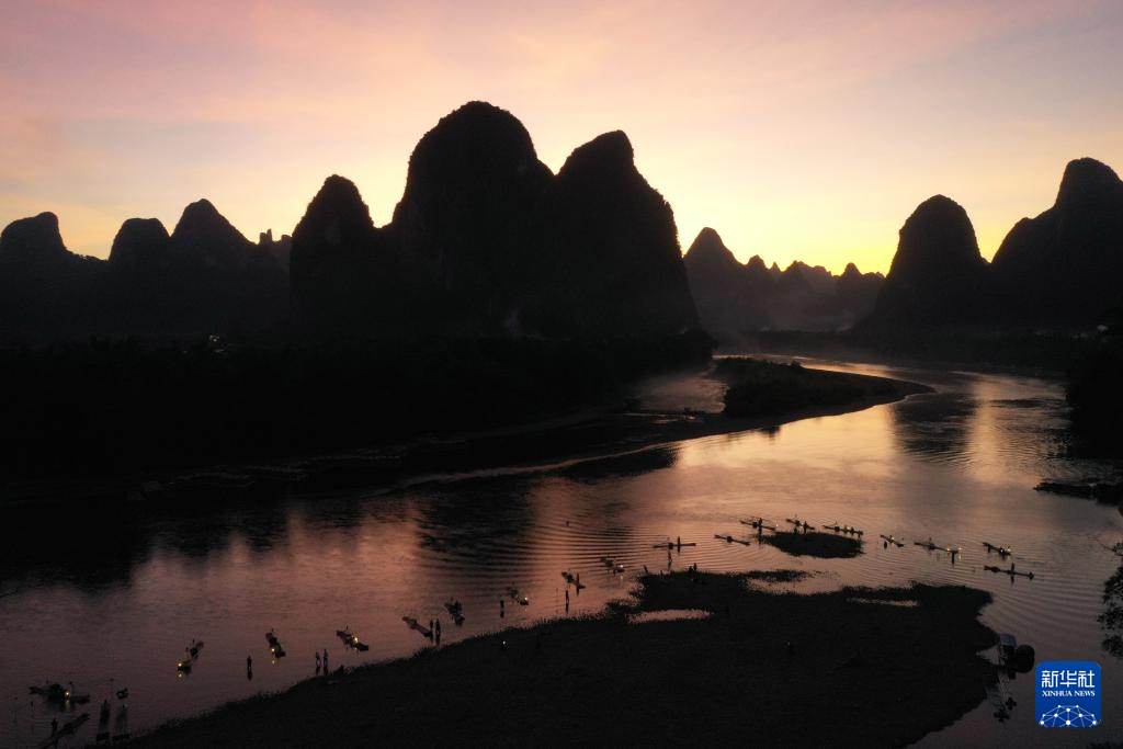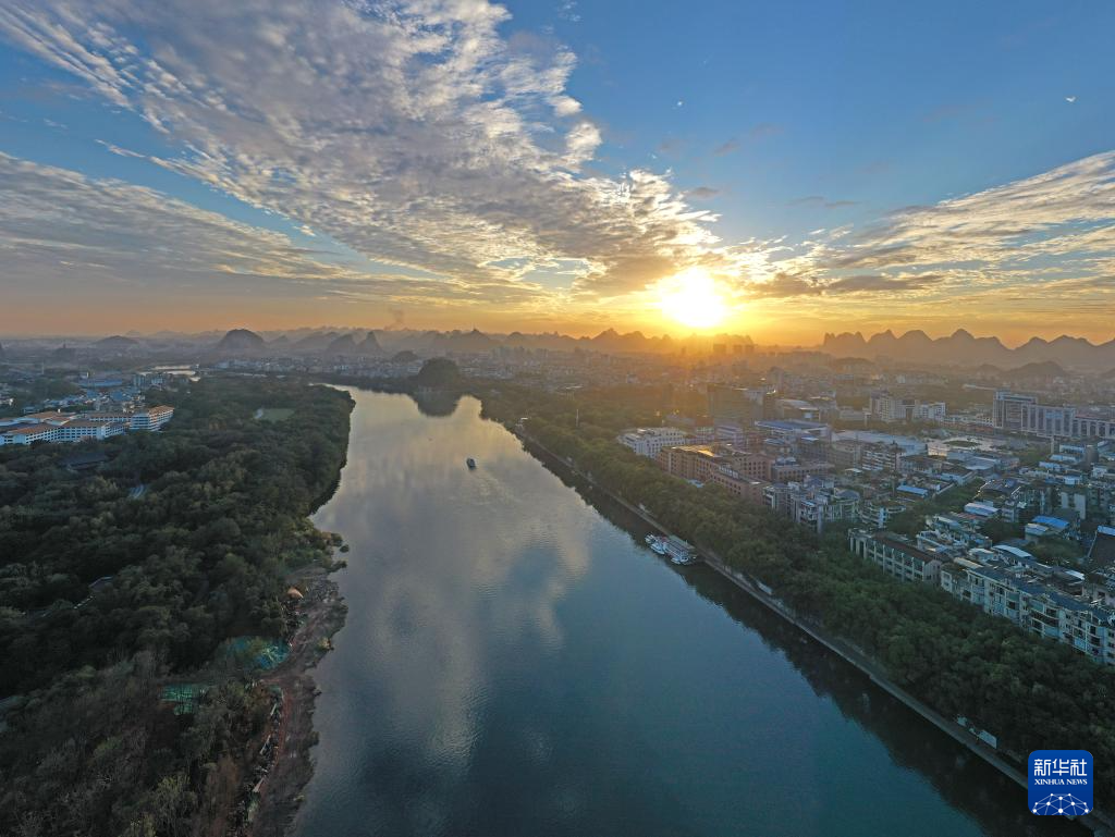 夕暮れの漓江。(2024年10月24日、ドローンから、桂林=新華社記者/陸波岸)