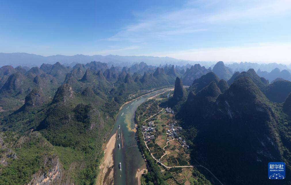 漓江の両岸に広がる風景。(2024年10月24日、ドローンから、桂林=新華社記者/陸波岸)