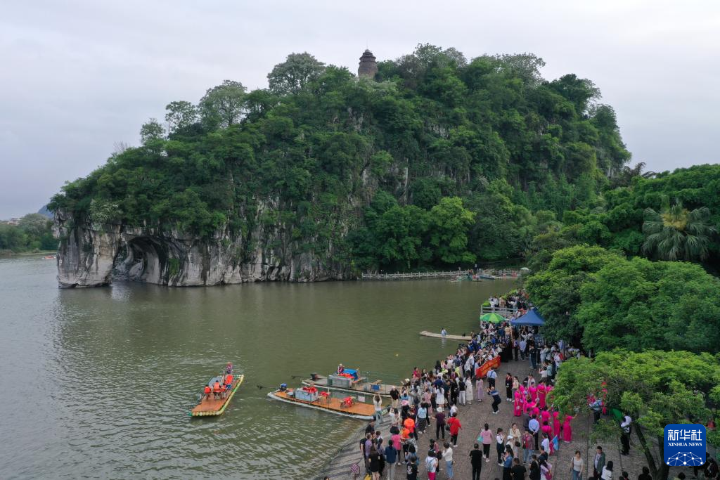 観光客でにぎわう桂林の象山風景区。(2024年4月18日、ドローンから、桂林=新華社記者/陸波岸)