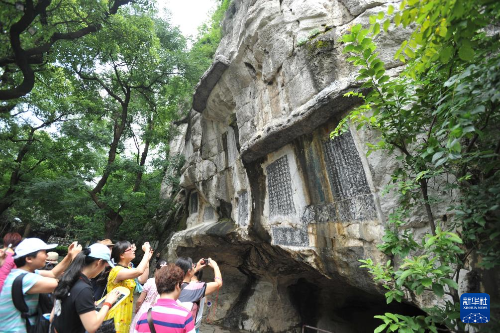 桂林にそびえる独秀峰の麓で「桂林山水甲天下」(桂林の美しい自然は天下一)の碑刻を見学する観光客。(2014年6月29日撮影、桂林=新華社記者/陸波岸)