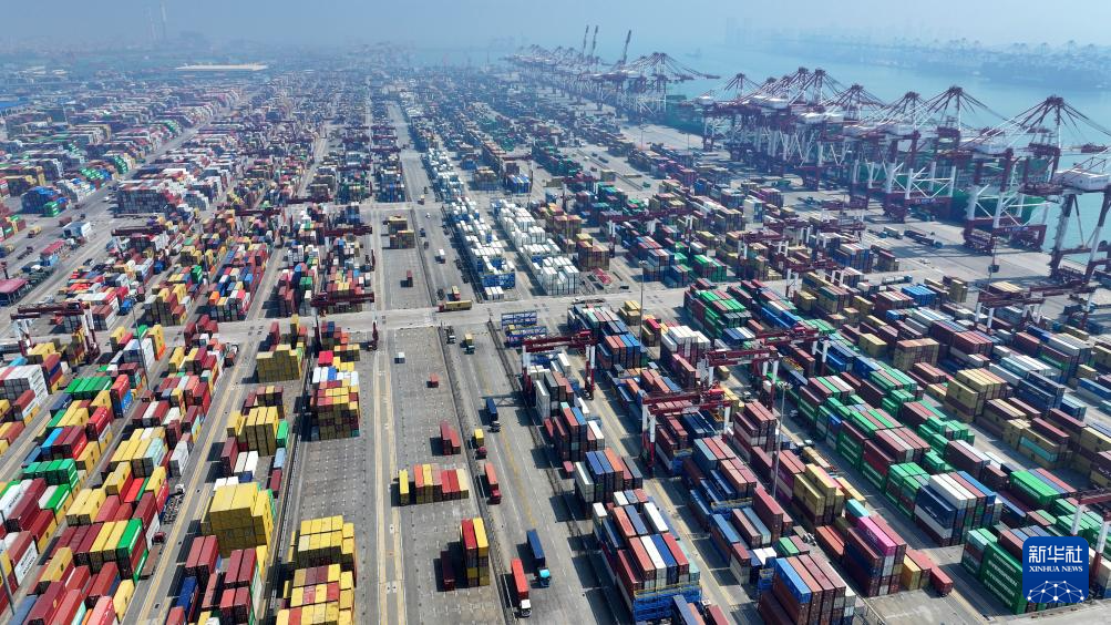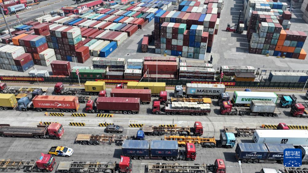 10日、山東省青島港前湾コンテナふ頭。(ドローンから、青島=新華社記者/李紫恒)