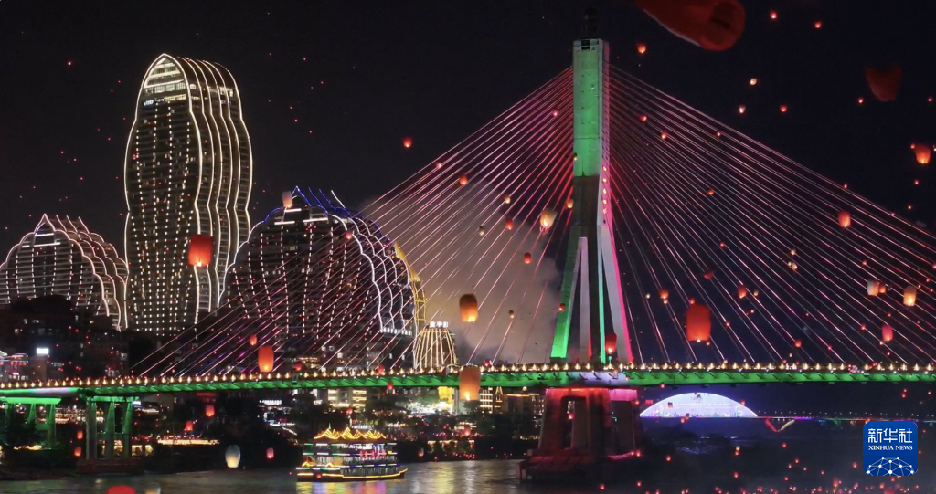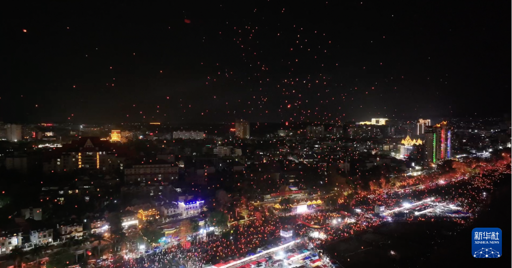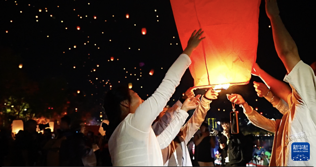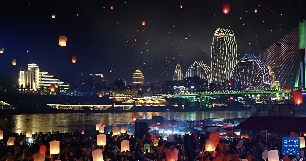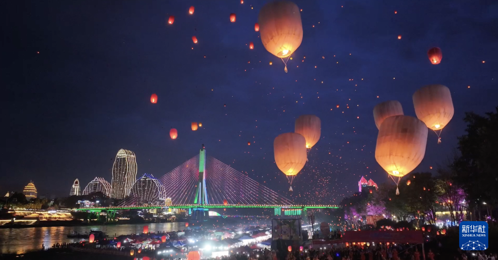 【新華社景洪4月16日】中国雲南省西双版納(シーサンパンナ)ダイ族自治州の景洪市で13日夜、ダイ暦1387年の新年を祝う行事の一つとして、孔明灯(小型の熱気球)を放つイベントが開かれた。市内を流れる瀾滄江のほとりに数万人が集まり、次々に孔明灯を夜空に放つと幻想的な光景が広がった。