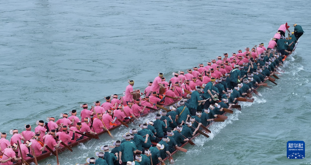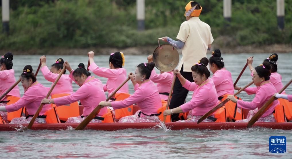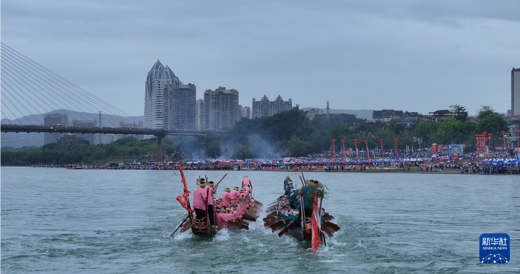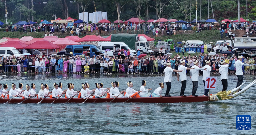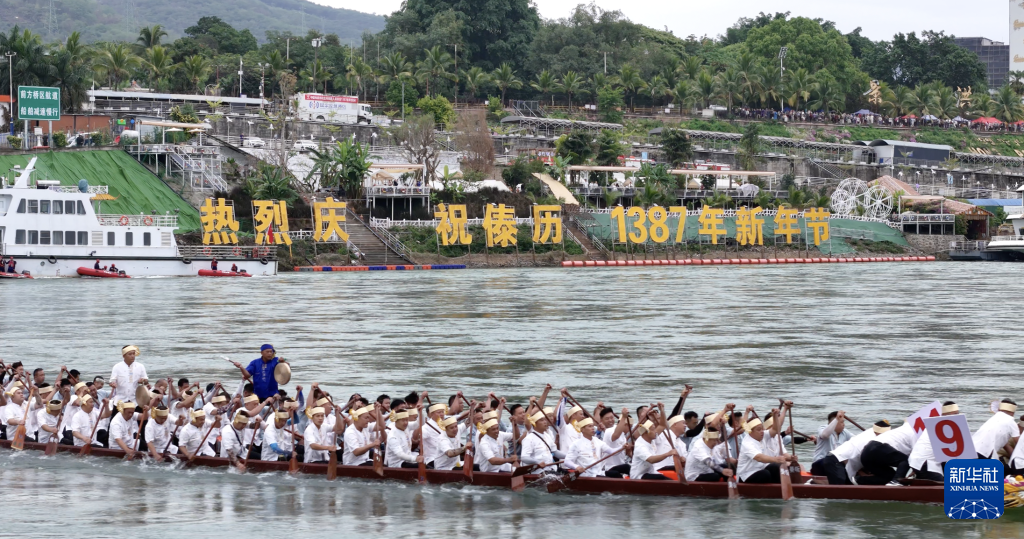 【新華社景洪4月16日】中国雲南省西双版納(シーサンパンナ)ダイ族自治州景洪市で13日、ダイ暦1387年の新年を祝う伝統のドラゴンボートレースが行われた。レースは水かけ祭りの山場の一つで、華やかに装った人々が瀾滄江のほとりに集まって観戦した。