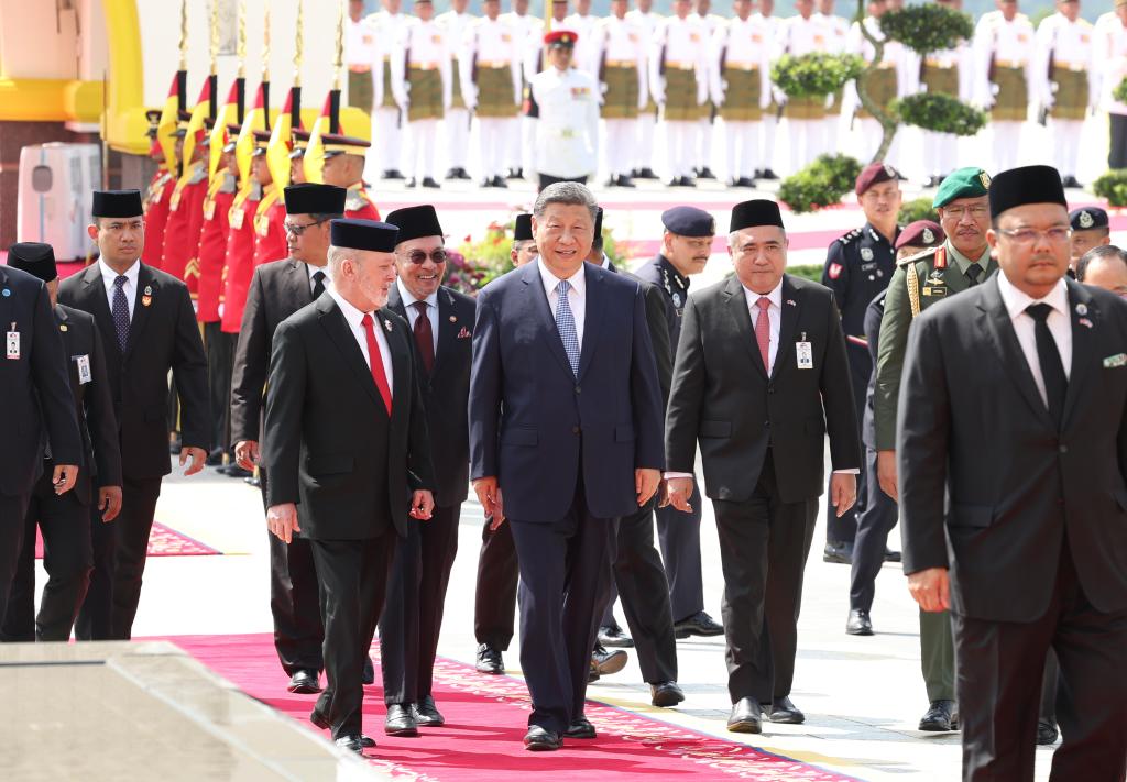 中国の習近平(しゅう・きんぺい)国家主席は16日、マレーシアの王宮で同国最高元首のイブラヒム国王と会談した。写真はマレーシアの王宮広場で、儀仗隊を巡閲する習近平主席。(クアラルンプール=新華社記者/翟健嵐)