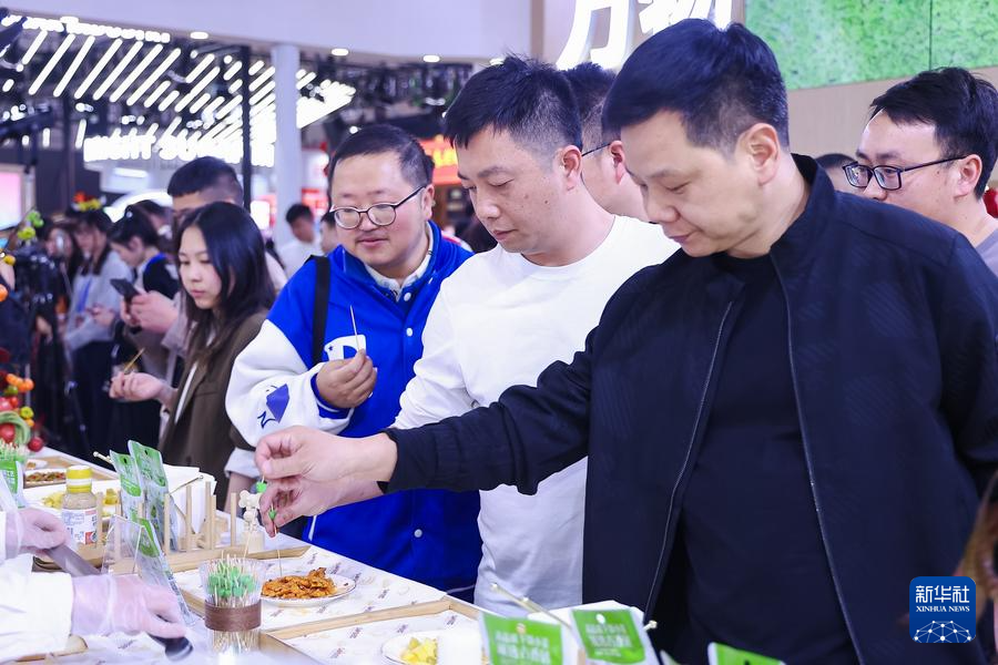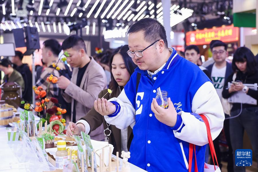 四川省成都市で開催された第112回全国糖酒商品交易会で、眉山市産の泡菜を試食するバイヤー。(3月25日撮影、眉山=新華社配信)