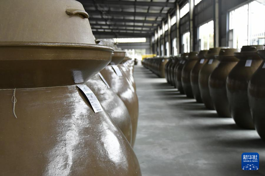 眉山市東坡区の四川老壇子食品に展示された泡菜の甕(かめ)。(3月20日撮影、眉山=新華社記者/王灝)