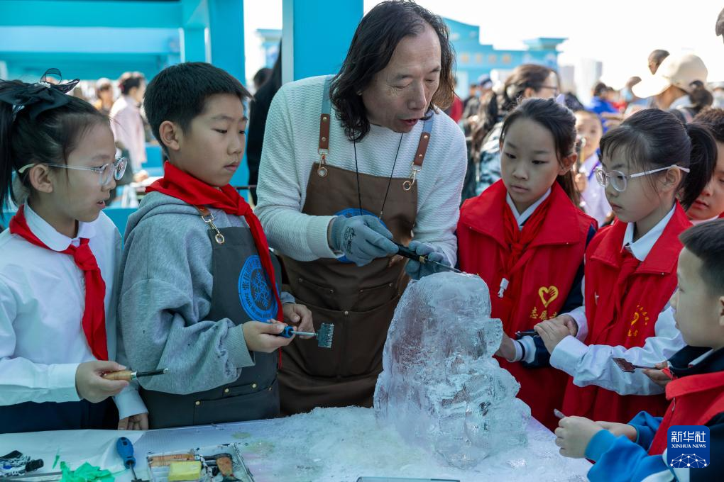 16日、川開き民俗文化ウイークの開幕式で、伝統工芸「氷彫刻」の技術を披露する無形文化遺産の伝承者。(ハルビン=新華社記者/張濤)