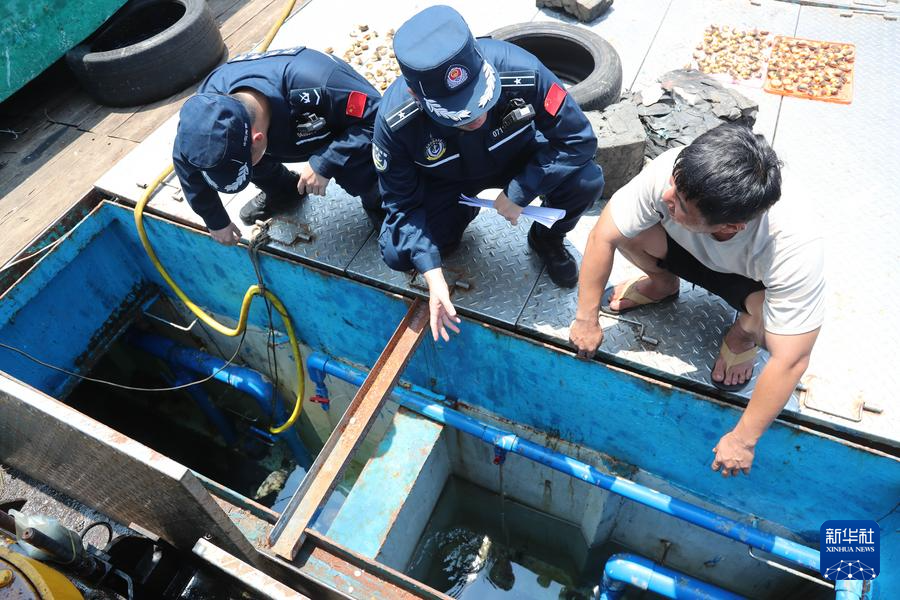 12日、黄岩島海域で中国漁船の海水槽を検査する中国海警局の法執行官。(黄岩島=新華社記者/高磊)