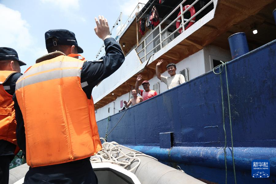 12日、黄岩島海域で臨船検査を終え、漁業者らに手を振る中国海警局の法執行官。(黄岩島=新華社記者/高磊)