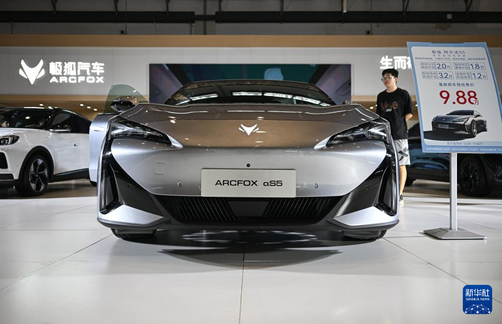 2024海報集団金秋モーターショー・インテリジェントコネクテッド新エネルギー車展で、北京汽車集団傘下の新エネ車ブランド「極狐(ARCFOX)」が展示した電動セダン「αS5」。(海口=新華社記者/蒲暁旭)