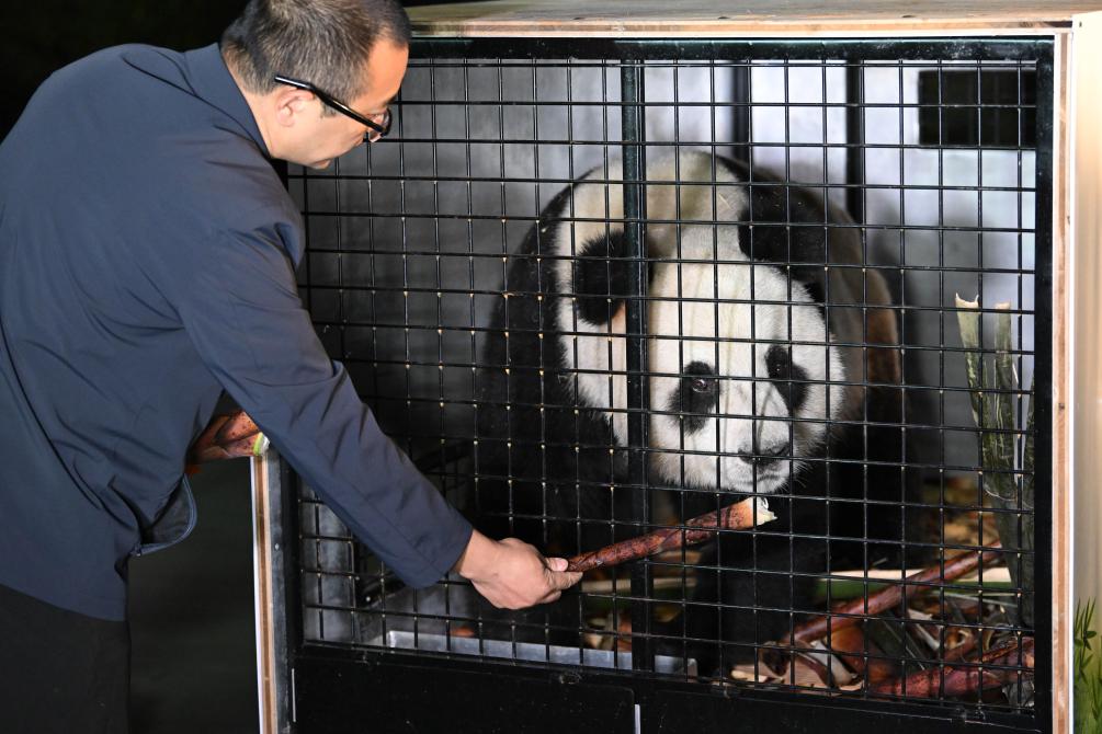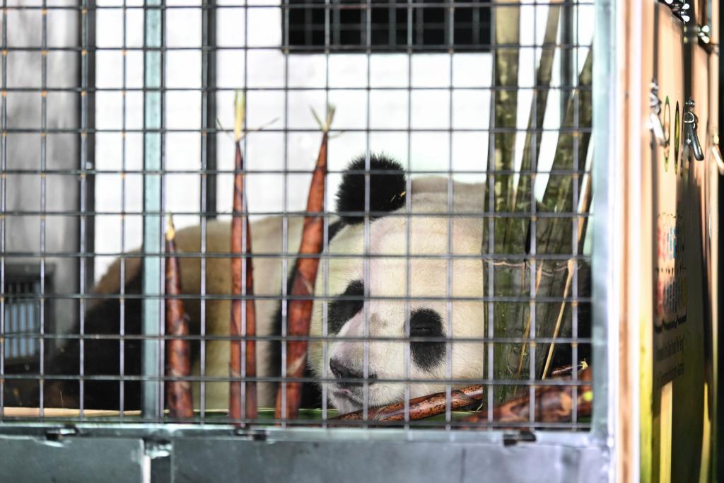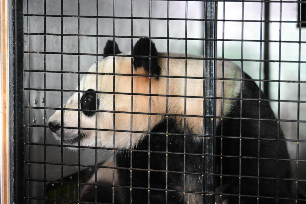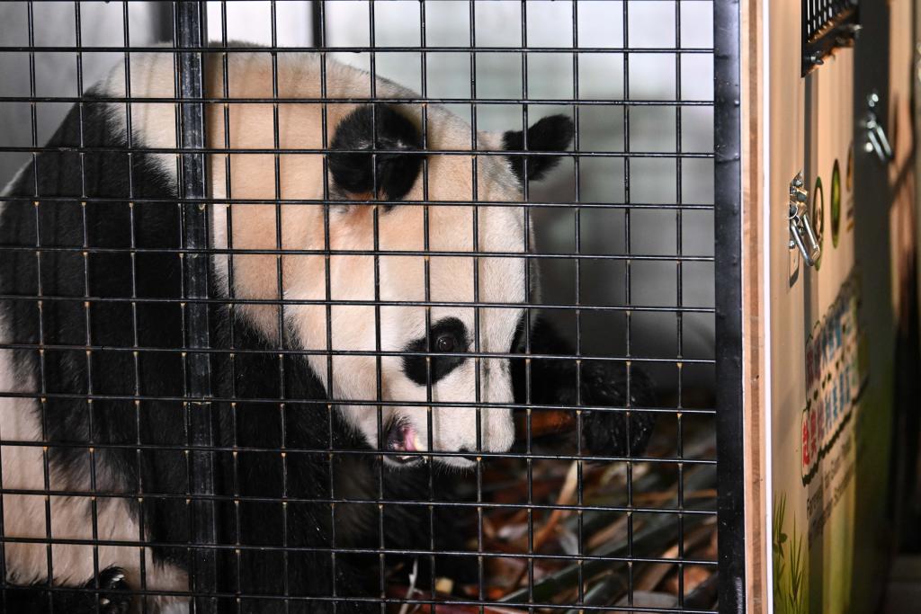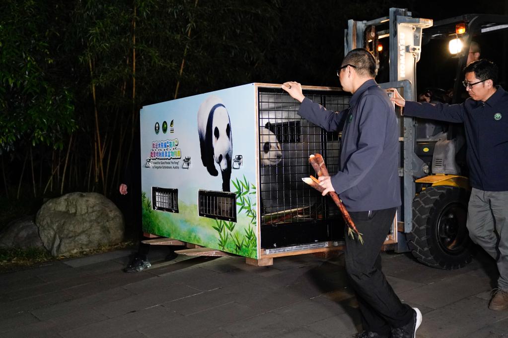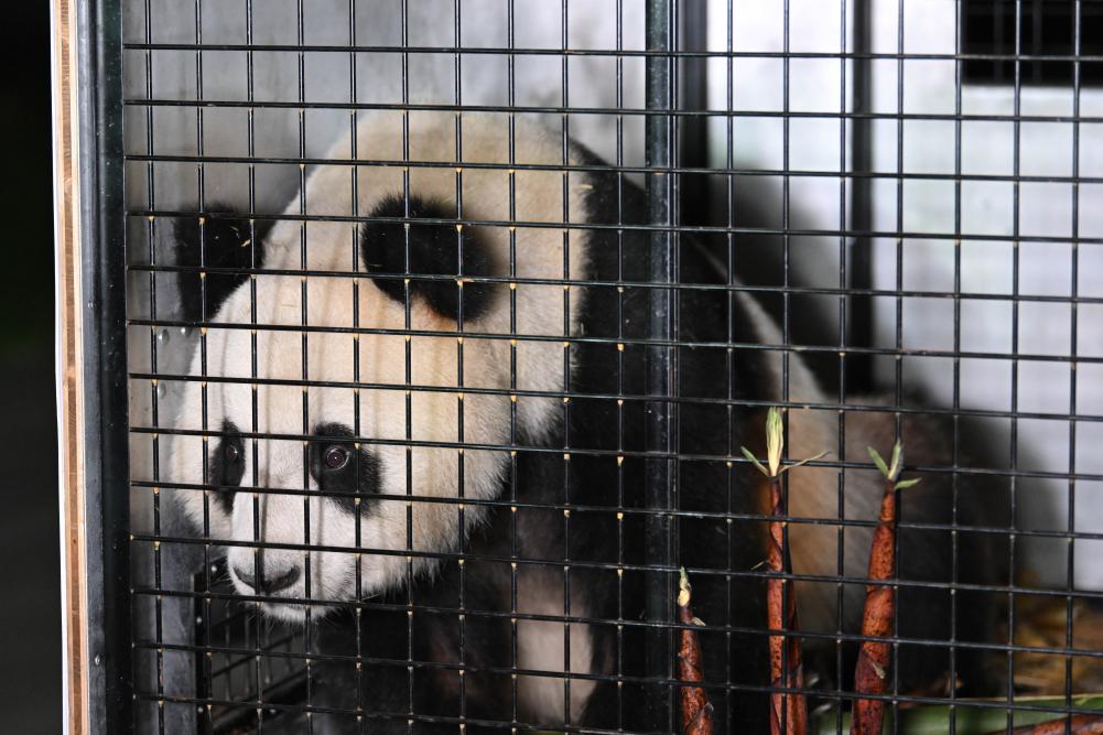 22日、ジャイアントパンダ保護研究センター都江堰基地で、ケージで運ばれる「蘭韻」。(成都=新華社記者/胥氷潔)