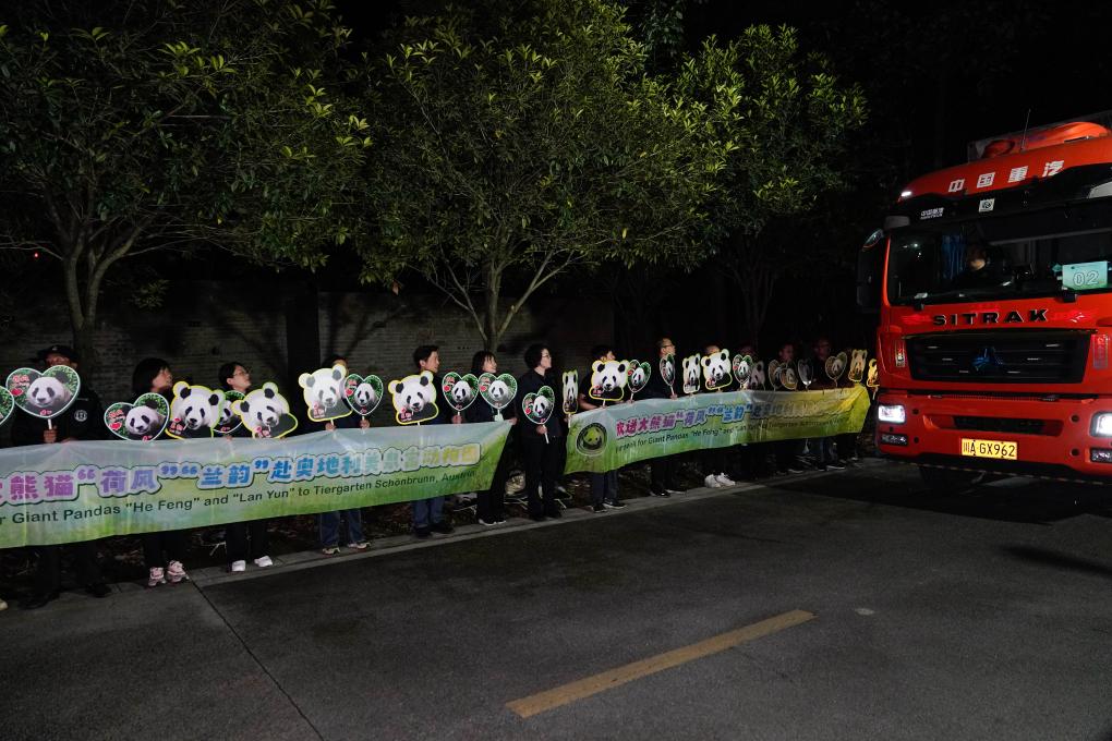 22日、「荷風」と「蘭韻」を見送るジャイアントパンダ保護研究センターの職員ら。(成都=新華社記者/胥氷潔)