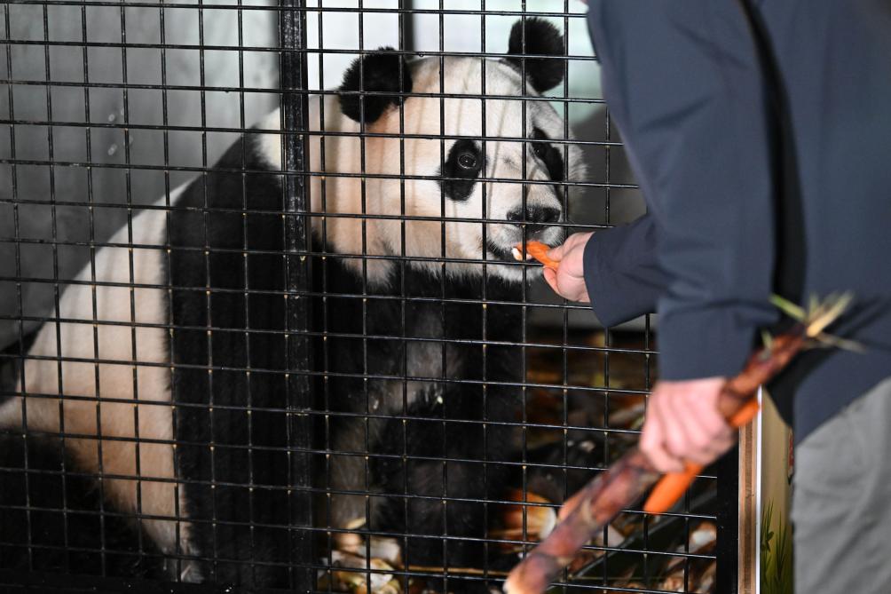 22日、ジャイアントパンダ保護研究センター都江堰基地で、職員の差し出すニンジンを食べる「蘭韻」。(成都=新華社記者/胥氷潔)