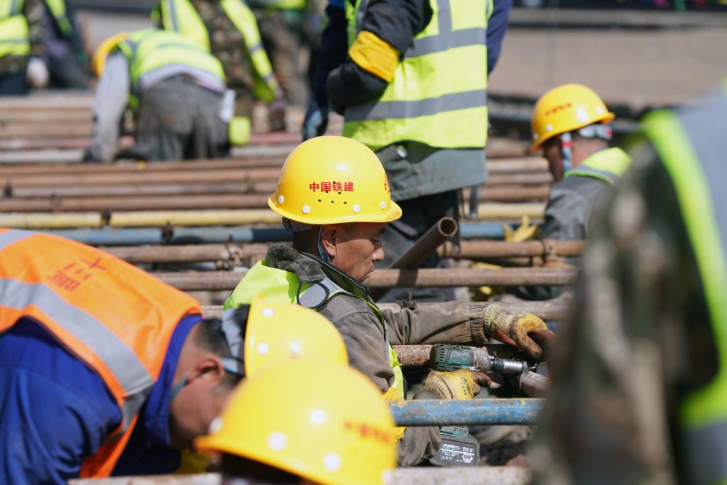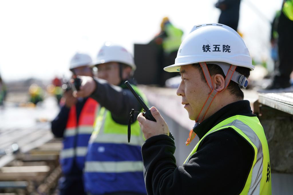 14日、佳木斯-同江鉄道改修事業の富錦駅改修現場で働く作業員。(佳木斯=新華社記者/王松)