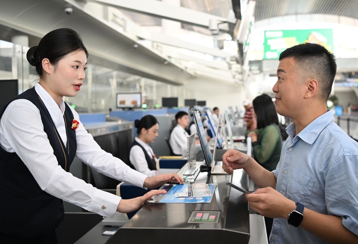 広州白雲国際空港のカウンターでチェックインする旅客。(2024年9月19日撮影、広州=新華社記者/鄧華)