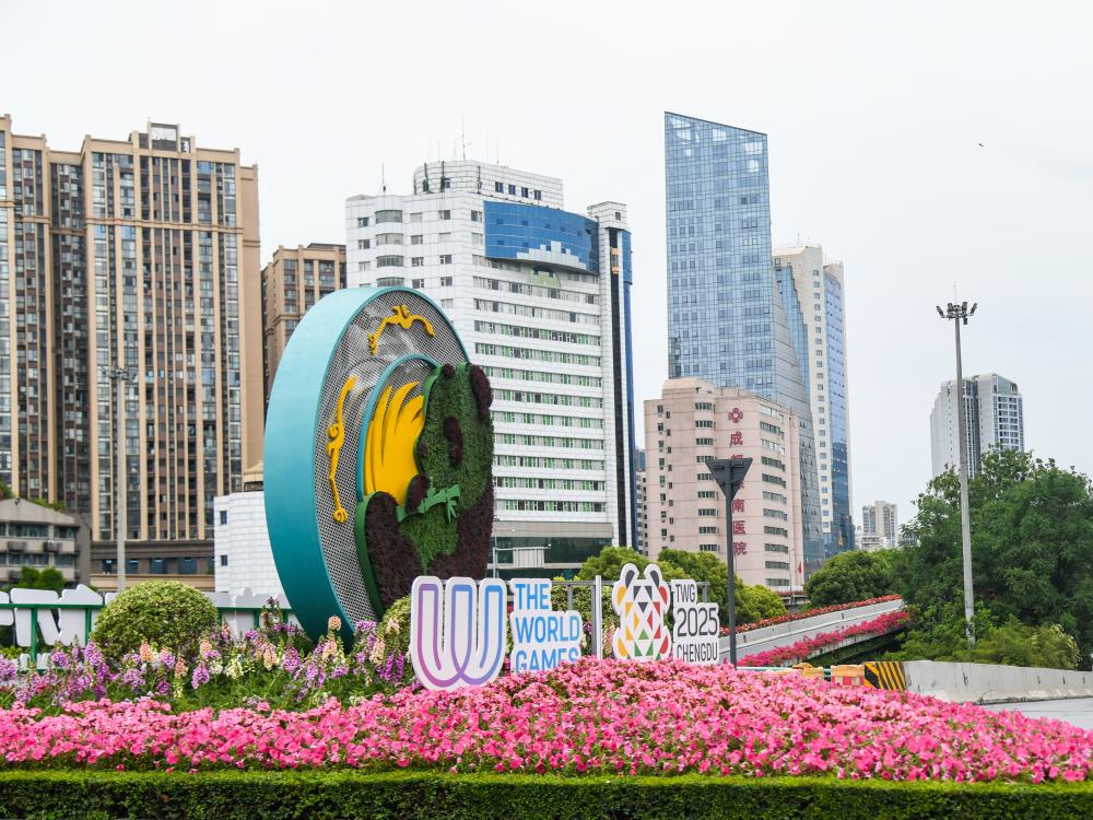 29日、成都市の人民南路に設置された、ワールドゲームズ成都大会の立体オブジェ。(成都=新華社記者/王曦)