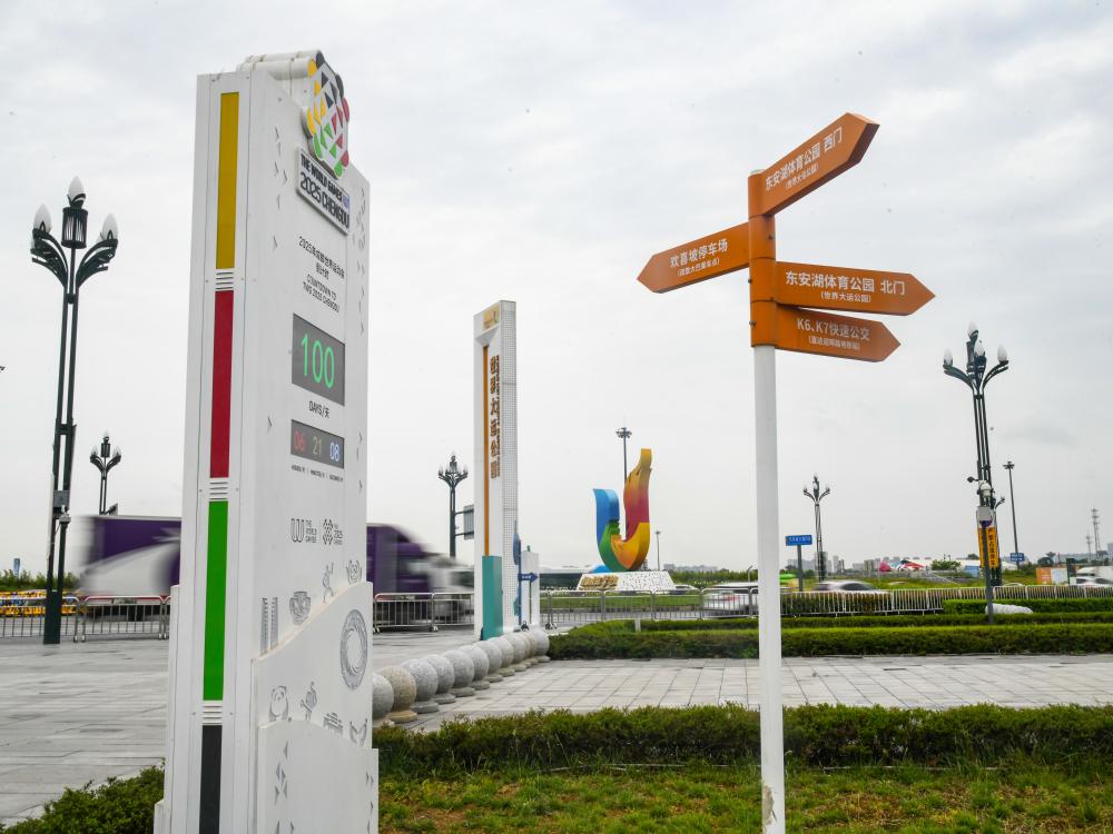 29日、成都市の天府大道(大通り)に設置された、開幕まで100日を示すカウントダウン時計。(成都=新華社記者/王曦)
