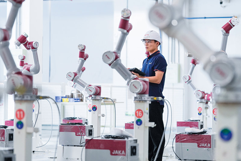 江蘇省常州市にある常州節卡智能装備の製造拠点で、協働ロボットをテストする作業員。(2024年6月15日撮影、常州=新華社配信)