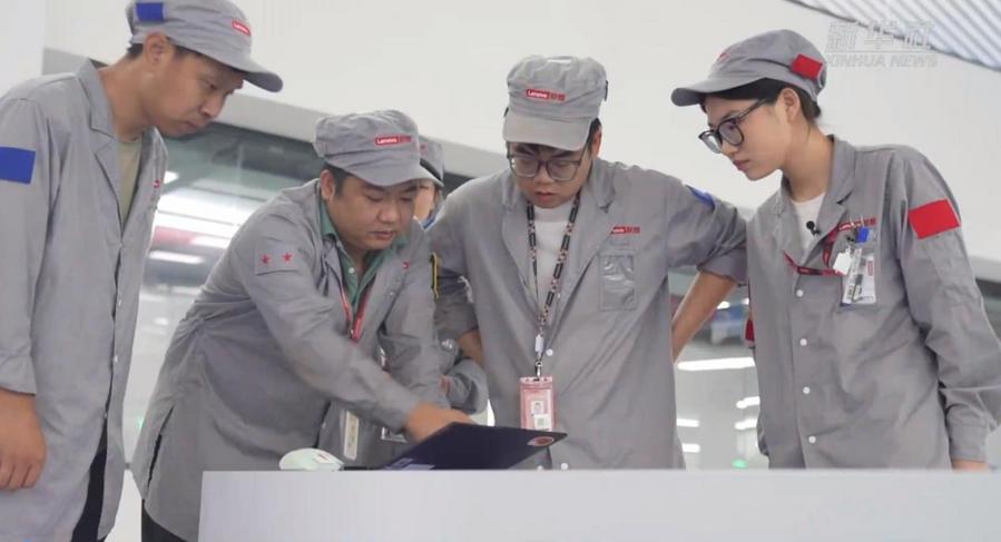 天津市にある中国パソコン大手・聯想集団(レノボ・グループ)の工場で、スマート製造システムを点検する作業員ら。(動画のスクリーンショット、天津=新華社配信)