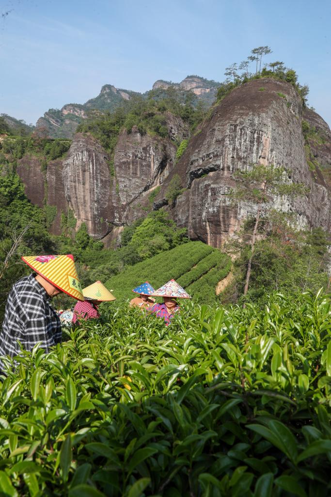 緑色生態茶園で武夷岩茶の茶葉を摘む福建省武夷山天心村の村民ら。(5月3日撮影、武夷山=新華社配信/邱汝泉)
