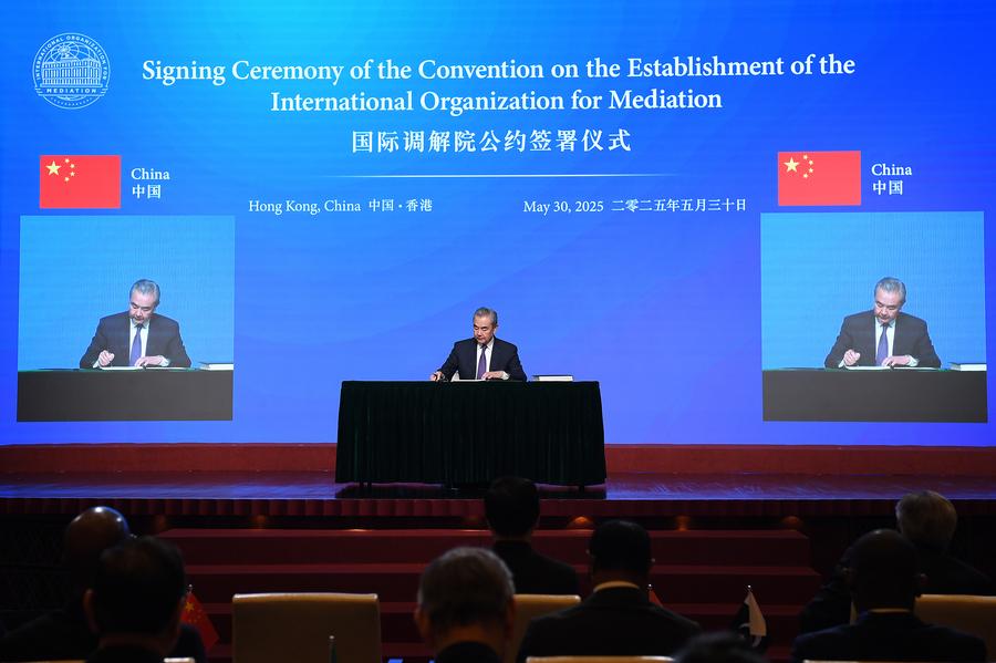 【新華社香港5月30日】中国香港特別行政区で30日、「国際調停院設立条約」の調印式が行われた。王毅(おう・き)共産党中央政治局委員・外交部長が出席し、あいさつした。
