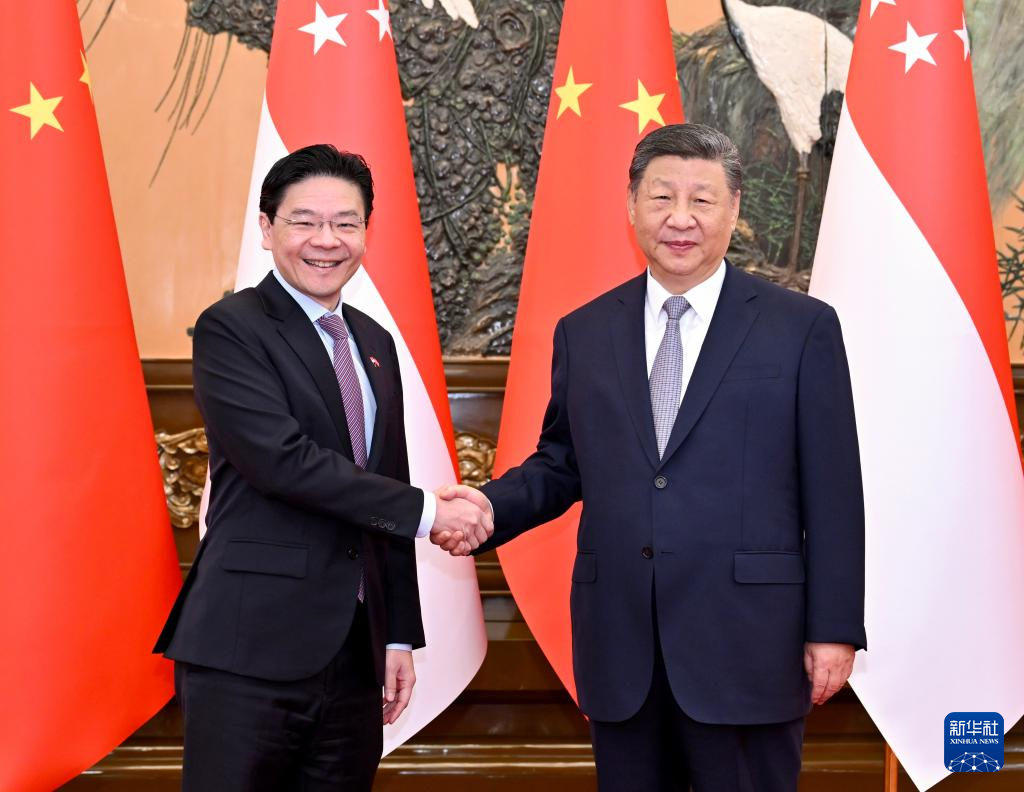 中国の習近平(しゅう・きんぺい)国家主席は24日午前、中国を公式訪問したシンガポールのローレンス・ウォン首相と北京の人民大会堂で会談した。(北京=新華社記者/岳月偉)