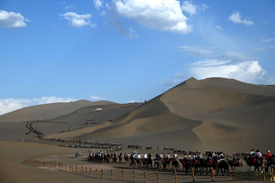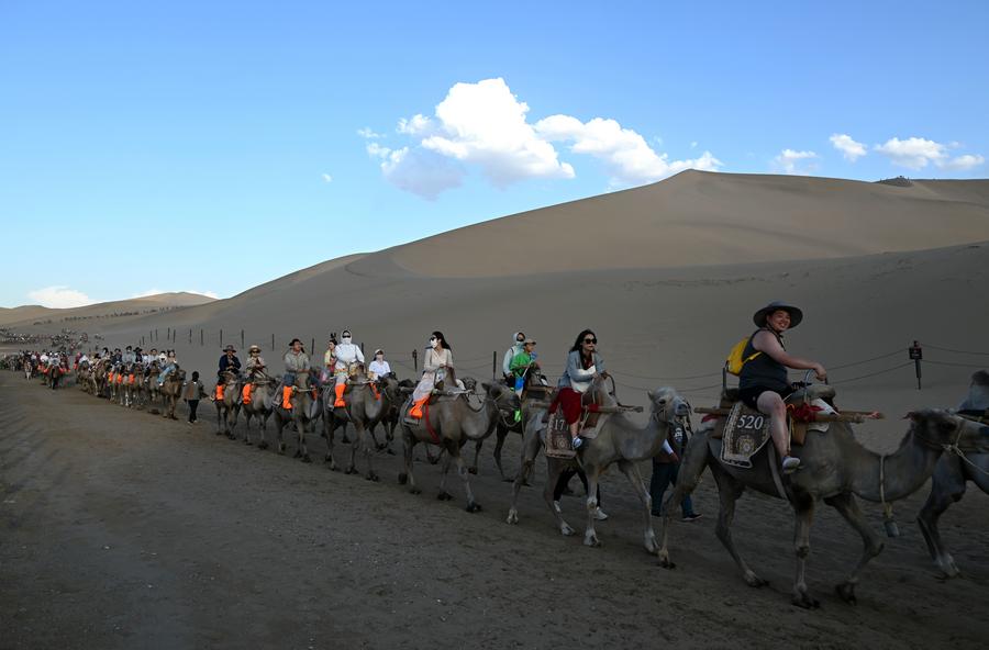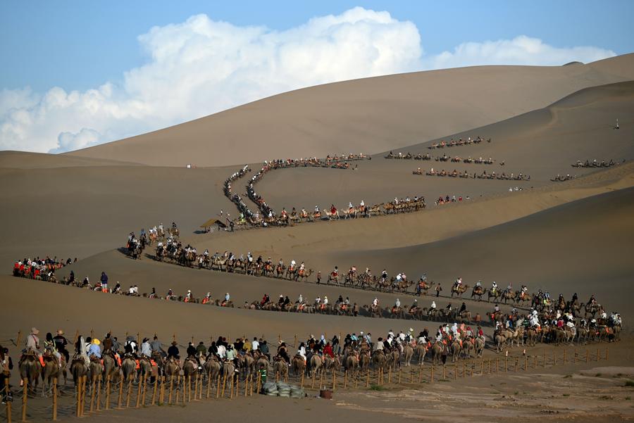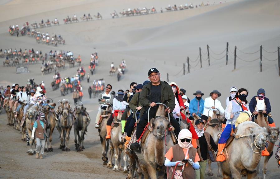 23日、鳴沙山・月牙泉風景区でラクダに乗る観光客。(敦煌=新華社配信/張暁亮)