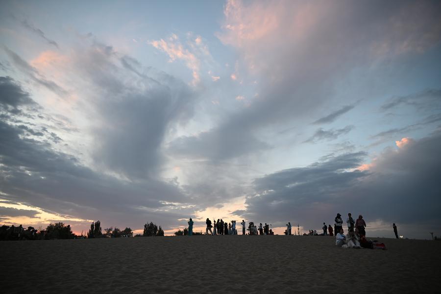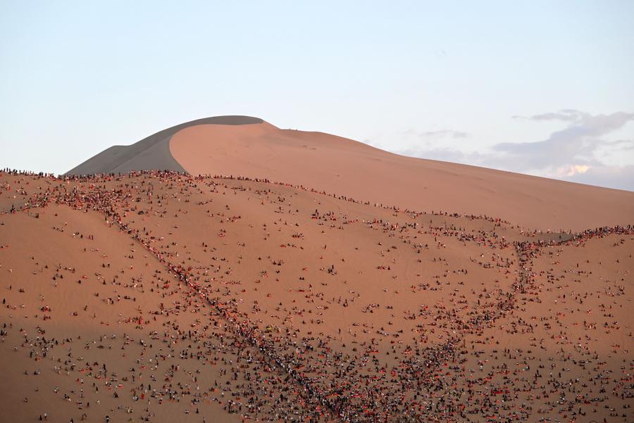 23日、鳴沙山・月牙泉風景区を散策する観光客。(敦煌=新華社配信/張暁亮)