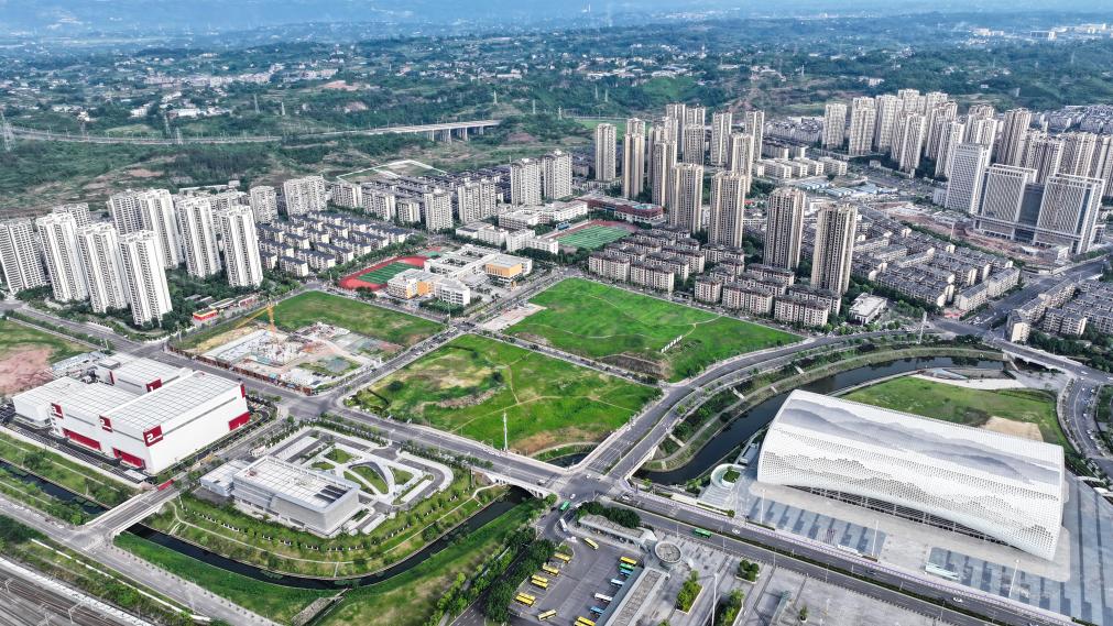 建設中の永川テクノロジー撮影スタジオ第2期プロジェクトとその周辺。(5月21日、ドローンから、重慶=新華社記者/王全超)
