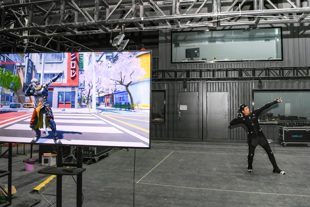 永川テクノロジー撮影スタジオで行われたモーションキャプチャー技術のデモンストレーション。(重慶=新華社記者/王全超)