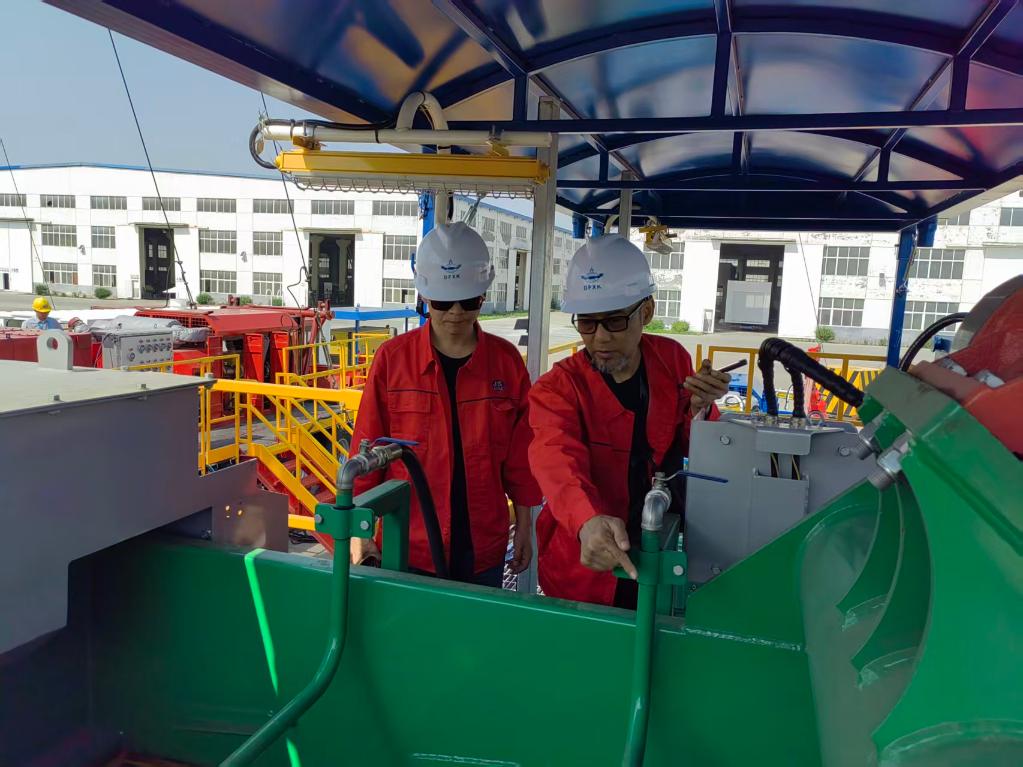 天津市東方先科石油機械の試験場でトラック搭載型掘削リグXJ350の振動ふるいの検収作業を行うインドネシアの顧客。(天津=新華社配信)