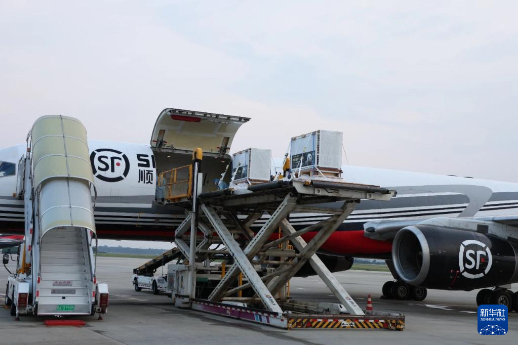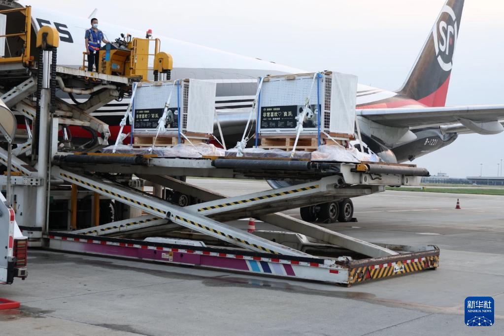 28日、パンダ4頭を載せ、四川省の成都双流国際空港に到着したチャーター機。(成都=新華社配信)