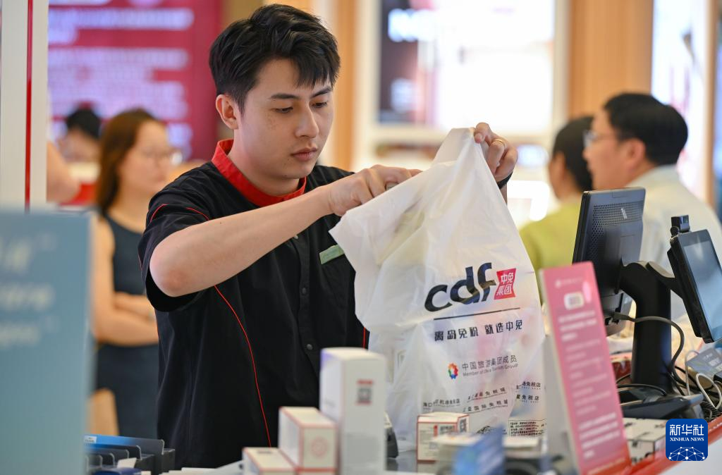 5日、海南省海口市の海口日月広場免税店で免税品を包装する従業員。(海口=新華社記者/郭程)