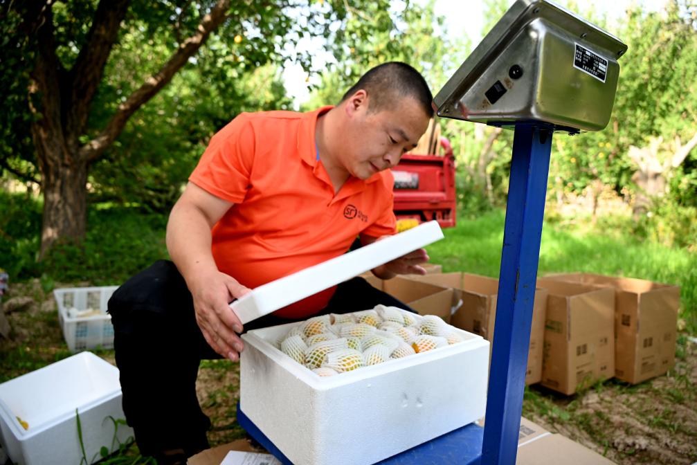6日、甘粛省敦煌市月牙泉鎮合水村で李広杏を箱詰めする配送職員。(敦煌=新華社配信/張暁亮)