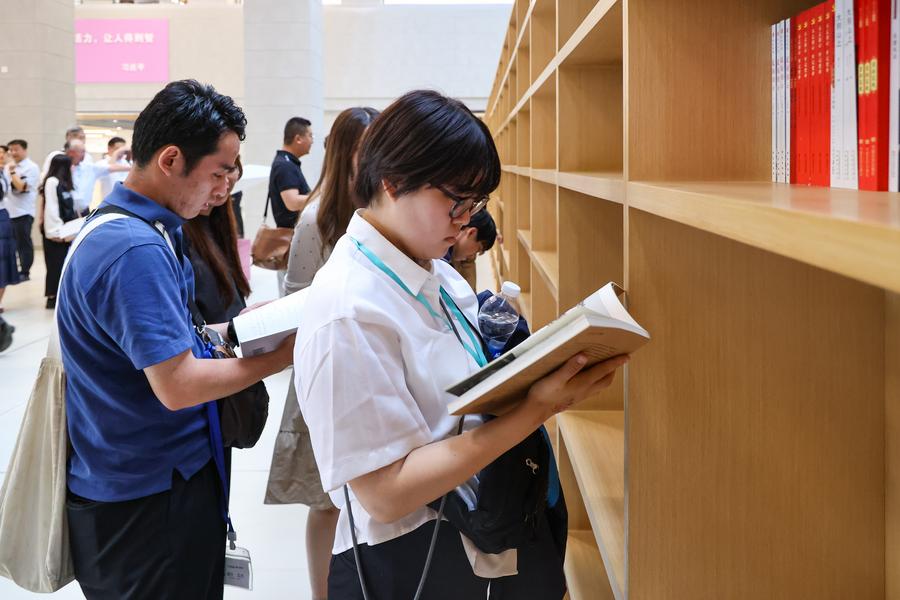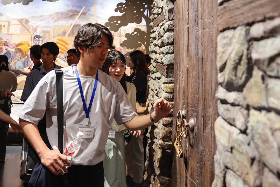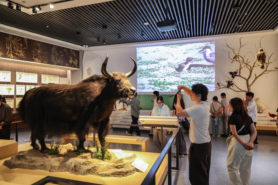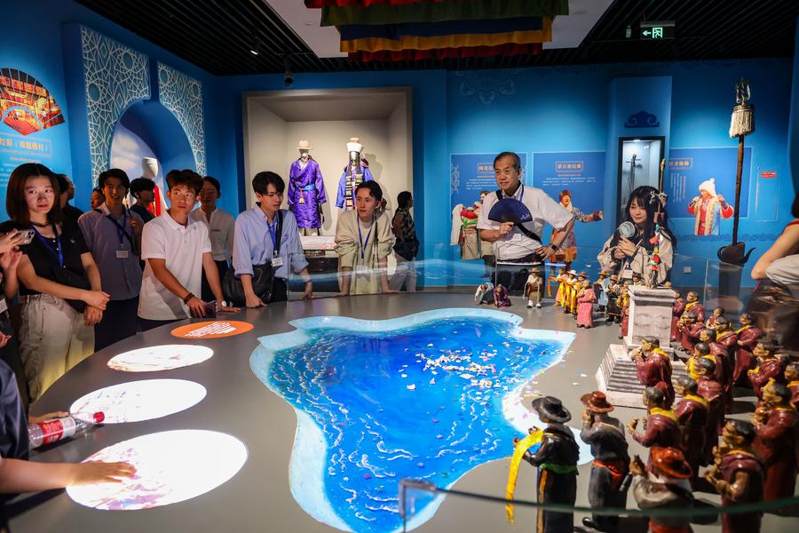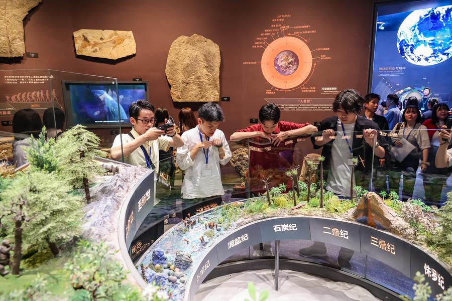 7月31日、青海省自然資源博物館を見学する創価大代表団のメンバー。(西寧=新華社配信/楊暁冬)