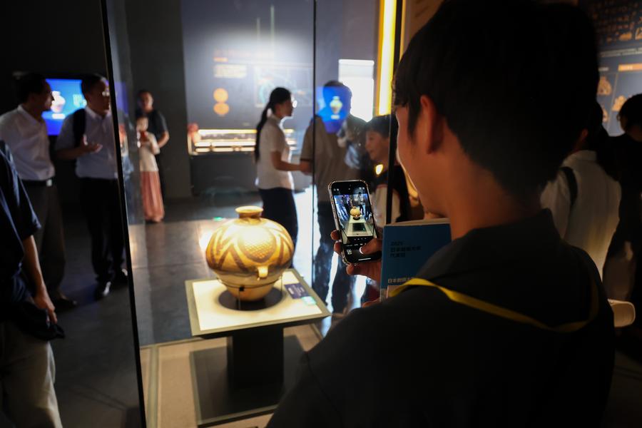 2日、青海省博物館を見学する創価大代表団のメンバー。(西寧=新華社配信/楊暁冬)