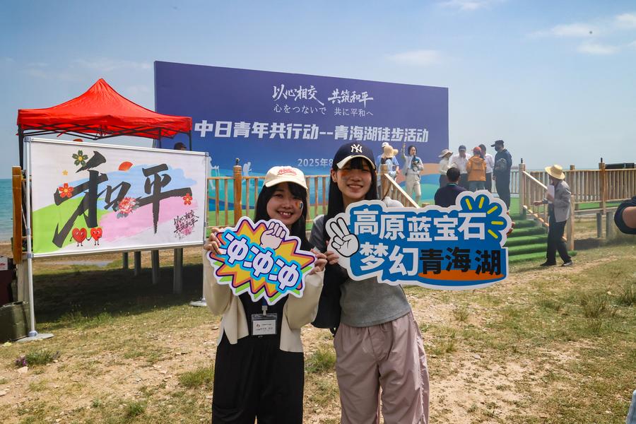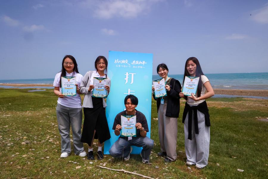 1日、青海湖国家級自然保護区で、中日大学生湖畔生態環境保護ウォーキングに参加した創価大代表団のメンバー。(西寧=新華社配信/楊暁冬)