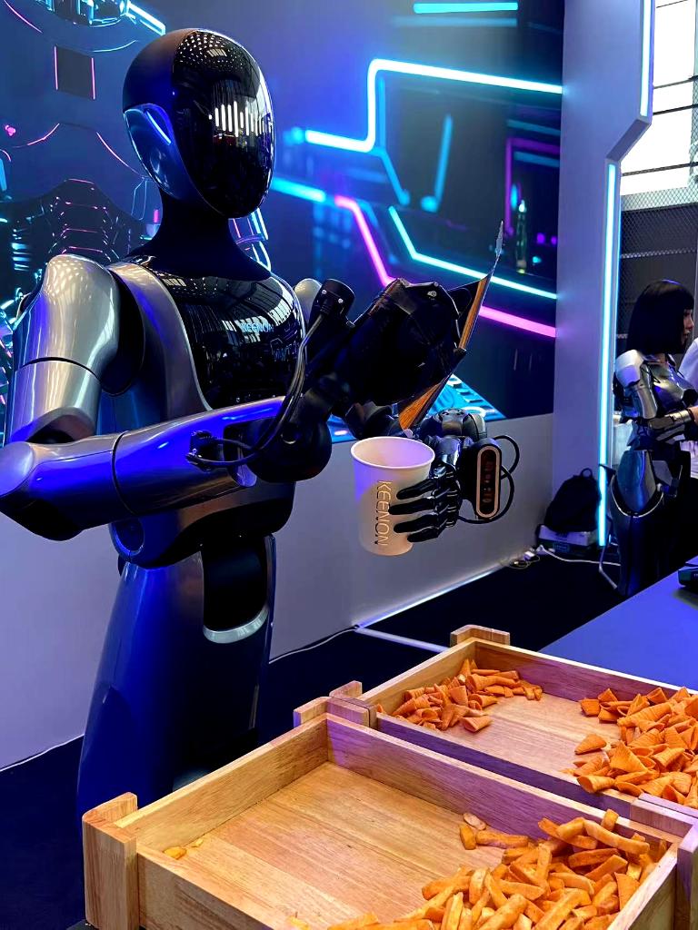 8日、2025世界ロボット大会の会場で、来場者に軽食を提供するロボット。(北京=新華社記者/魏夢佳)